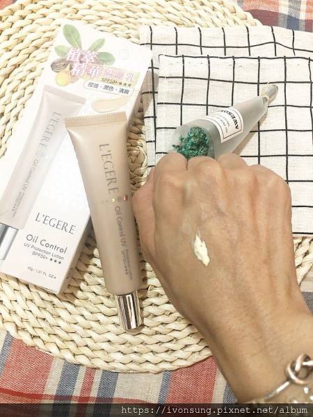 黃色全效控油,擠出來是膚色質地的乳液,延展性也很好,很好推勻,