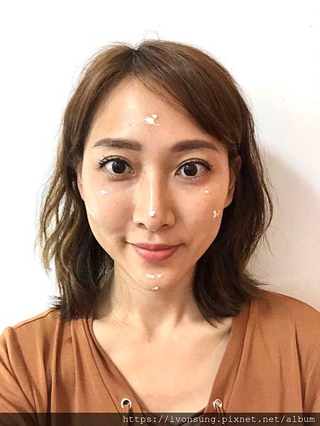 或是先擦一層黃色打底,接著蘋果肌跟鼻根下巴再用紫色的打亮修飾!